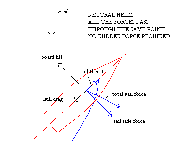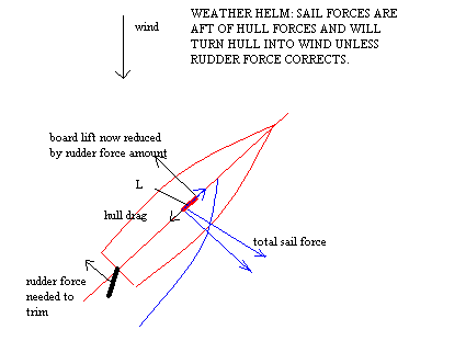 Now there is a rotational force trying to turn this boat to the right, away from the wind. You can hold the boat straight by applying a rudder force to the left (tiller right) to balance it. That rudder force must be balanced by the leeboard force adding to the board's side force. This situation is called "lee helm".