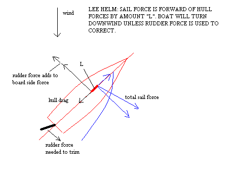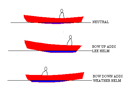 Let's say the captain builds that boat in the first figure perfectly. He goes for a sail sitting in the stern along with his gal and their beer and the stereo and maybe a 20hp motor. The boat squats down in the stern because of the weight there. The bow is way up in the air. She still floats fine but with that stern way down and the bow way up, when she turns into the wind, the the bow is trying to get blown backward. The skipper corrects by adding rudder to turn it into the wind, giving him lee helm under the situation. The opposite situation would be to have all the weight in the bow to give the boat more weather helm but that hardly ever happens because the tiller is in the stern. But there have been boats that were steered by changing trim this way. John Gardner in one of his books describes racing with fleets of skiffs (in New York, I think) that had spritsails and no rudders. All steering was done by skippers running fore and aft in their boats.