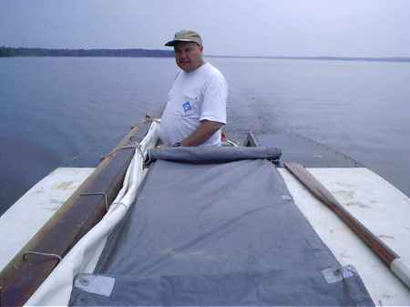 You can see we had no wind to speak of on Saturday, a rowboat delight! Me, I brought a Bolger boat, my Birdwatcher. You can see it crammed onto the little beach (high water again at Rend Lake) in the photo by the table of contents. Now powered by a quiet outboard Birdwatcher has proven to be a great all around camping boat. The long cabin slot can take several men at once making it a great photo boat too, with its deck at a height similar to your tavern's bar. Here the slot is covered for drizzle we had on Friday, with Max hisself at the tiller as we motor in quiet water.