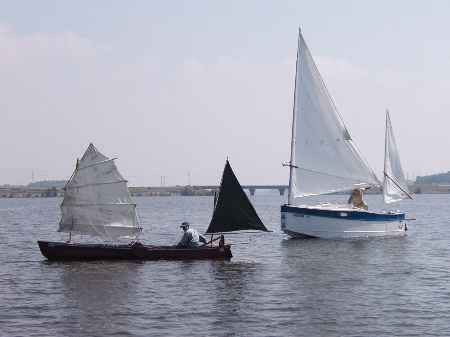 Here is a two for one. The Micro is a stretched to 18' job (but not a Longmicro) now owned by Tom Cole. The canoe is from Henry Laurent of Iowa and has a history of long voyages. The sail rig is still in testing.