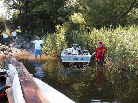 Here Max directs traffic to make room for an unusual boat called Church by Guy Boyce from Chicagoland. ("I spend my Sundays in Church," he says.) It is actually a very modified old fiberglass runabout taken from the dumpheap and rebuilt a lot better than new.