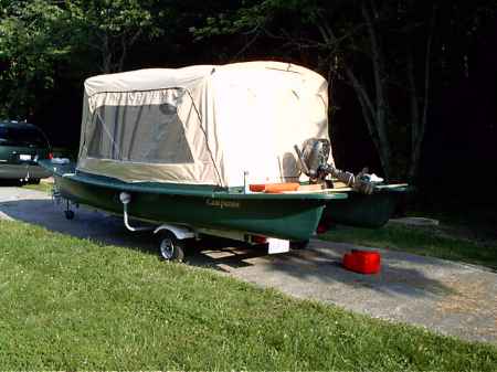 Mike Zenker brought this Campcanoe down from Chicagoland. It is a factory boat but is stranger than the homebuilts. Two canoes stuck together with a folding frame, a platform in the middle (with kitchen table), and a screenhouse on top. To trailer you fold up the house and flip one canoe on its hinges on top of the other. Very very clever.