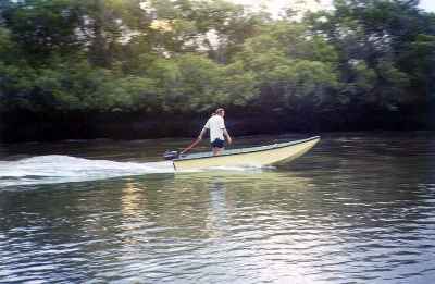 Luke ran the boat with several motors. Here it is with a 2.5hp (I think). Don't stand up in a boat like this in real life (I think gravity works the other way in Australia and you can't fall "down").