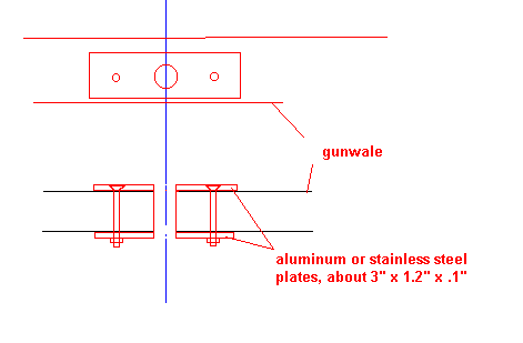 What we have here is simply two metal plates bolted to the wale with the proper sized hole (usually 1/2") drilled in each. Phil had his made of stainless steel. I made mine out of aluminum and have had no problems. I used an aluminum yardstick of the type carried by lumberyards for use with drywall as the basic material. I think the metal is about 1/10" thick and about 1-1/8" wide. I cut the aluminum to 3" lengths, stacked them up and drilled the oarlock hole and the bolt holes all at the same time. Filed off any sharp edges. Clamped the plates in the proper position and drilled the wooden wale. Bolted the plates in position and that's it. These work well because the oarlock bears on the metal parts which are about 1" apart, a bit more than the usual shallow factory sockets. So far I haven't worn them out. By the way, it helps to grease any oarlock from time to time, ordinary Vasoline works well.