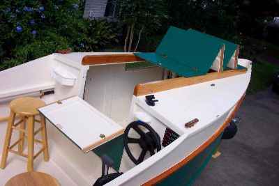 AF4 is supposed to do about the same job. Its simple hull shape won't handle rough going like the dory, but it's very easy to build and roomier. This boat has an open bow well for anchors and junk. The cabin is 8' long and 3' deep and 4' wide for minimal camping. It should be comfy for one and snug for two. it has a slot top to allow stand up boating in good weather. You cover it with a snap on fabric piece in the rain and cold. The cockpit is a full 6' long and 4' wide and totally open. You could lounge there too with a folding chaise. Aft of the cockpit is a draining motor well which will take the standard 6 gallon fuel tank and then some.