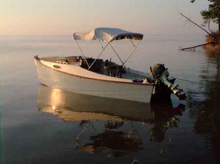 AF4 is a simple low powered cuddy cruiser intended for protected waters. Kilburn Adams of St. Louis brought a boat similar in spirit to AF4 to our Midwest Messabouts and it was easy to see what a good idea this is. Kiburn's boat was a modified Sturdee Amesbury power dory with a small cuddy added and a new 4 stroke Yamaha 10. He thought the empty boat weighed about 600 pounds ready to go. It planed quite well with two men on board at about 13 knots. He made a 60 mile trip on the Mississippi (above the Alton dam where the current is small) burning about 4 gallons of fuel. It's quiet and cheap to operate. It's a good idea now that smaller 4 stroke motors are more common.