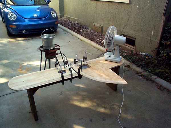 Here is a photo of Tidmarsh's total set up. Lead melting, fan to blow away any fumes, rudder and leeboard near and ready for the pour, and Volkswagen warmed up and ready to go for more wheel weights if needed.