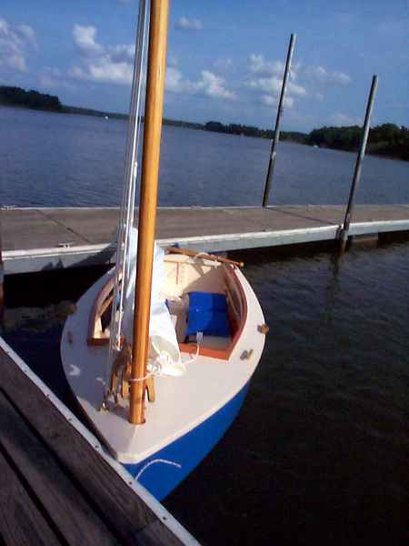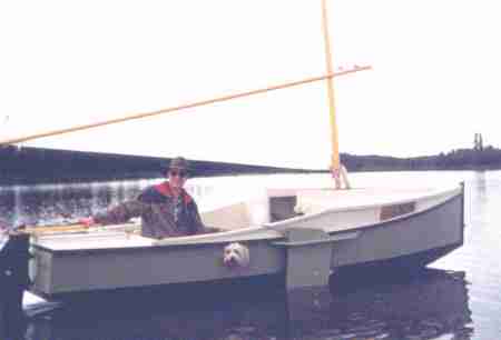 Ladybug's hull has the layout I like the best - a 6-1/2' cockpit between two storage/buoyancy boxes. It would be a great solo camping boat. The buoyant wooden spars prevent it from turning turtle. You bring it upright with weight on the lowered leeboard. Then you must climb back on board and a slot in the rudder seems to be the best boarding ladder around, bringing your weight back on board where it least affects the boat. You will have to bail some water.