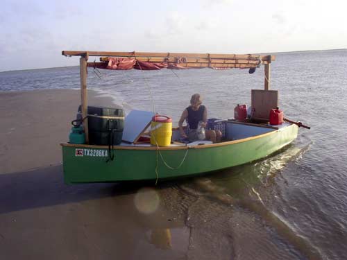Chuck Leinweber of Duckworksmagazine.com built the prototype and brought it to our Rend Lake messabout so I had a chance to go for a long ride in it. One thing that impressed me was how large it was for a 14' boat. In the opening photo you see it sail with three men on board, all comfortably sitting to windward on the bench seat, and I'm told it has sailed with four men with no effort. I do think it would be quite suitable for a family of four say with lots of room for all and storage space for all their junk. Here Sandra Leinweber sets things up at a recent campout on the Texas coast: