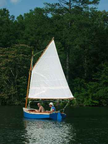 I've kept the same sail as with Woobo, a 75 square foot balanced lugsail. It hoists on a 13' mast with 11' yand and boom. All very low tech built with common materials.