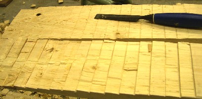Now smooth these "steps" down a bit more in the opposite direction. Sharpen the chisel first! More on how to do this a bit later. Hold the chisel almost flat to the stock. It's OK if you chisel a bit too flat, but you don't want to dig in too deep. Be especially careful if the grain is trying to "help" the blade dive in - that would be a very good time to cut across the plank instead. When you're done with this step you should still see most of the kerfs, but they will be very shallow.