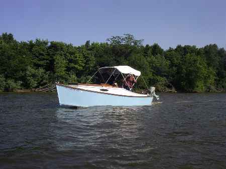 I went to multichines with Rogue and would expect her to be a good sea boat for the size, at least when rowed solo. (That is another argument for a longer boat. When loaded with a passenger the weight in the boat gets pushed to the ends and in rough water the boat will not lift itself over the waves but instead pushes through them and that usually slows you down. A longer boat is not affected as badly here.) I'm quite certain that a multichine hull has less drag all around than a flat bottomed boat, although I suspect the V is better yet. The multichine hull is a very good compromise in that it will beach flat and have draft somewhere between a flattie and a V bottom, everything else being equal. My first rowboat, Roar, had a hull like Rogue, but was 14' long. I found out from it that a multichine has little resistance to side loads, as in a cross wind. Thus to avoid needing to row in a "crab" in crosswinds, a multichine needs a lot of skeg area and a full length keelson.
