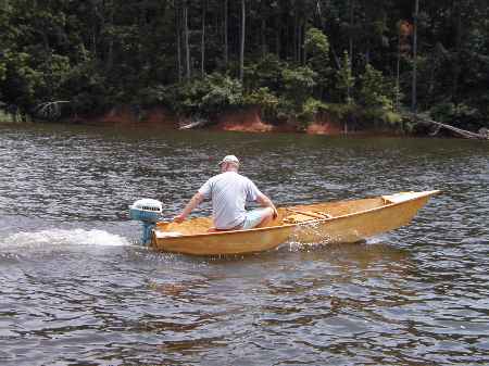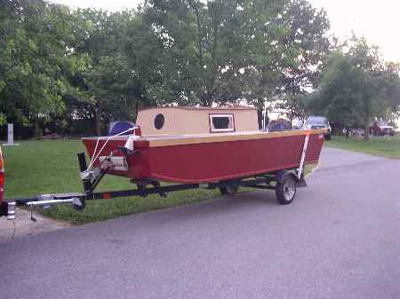 Saturday brought Bill Pettit and his modified Campjon. He shortened it 2' by truncating the snout but that won't bother it in smooth water (and a jonboat is not a rough water boat in any case). The cabin is also different from the plans Campjon but it all was very well done, I though. He went fishing in it Saturday but he had to hurry home and I didn't get a chance to try it out with him: