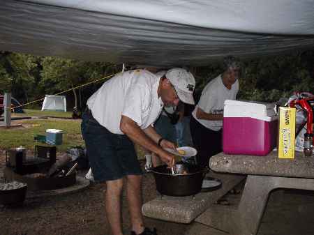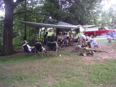 We have this fairly unplanned cookout on Saturday evening. This all done under one of Dave Gray's big white polytarps since it would shower every now and then. Max and I run into town to buy the basics but all the other goodies are pitched in by the folks. Good variety and no one goes hungry. Got to talk with several folks who did not have boats there but more important brought themselves. The sign in sheet shows they were David Billsbrough, Robert Eggers, John Sellers, Roger Shull, Marc Pauls, Chris Feller, James Dagger and Paul Haynie. I found this year that the evening and late evening and really late evening conversations were sustained by these folks.