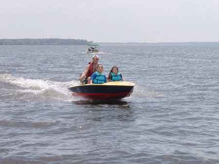 Jeff Hoesel brought another small runabout complete with an antique motor. The design is a Jinx from the free plans that magazines like Science and Mechanics offered in nearly every issue back in the the 50's and 60's. Here he takes his two girls for a spin. I guess this is what we did before jetskis but this is on 12 or 15 hp: