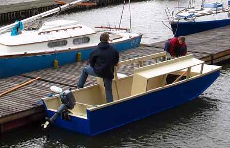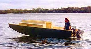 As for power I would suggest a good 15 hp motor or a 10hp to keep the capability of using the smaller lakes which are wisely limited to 10 hp. With 10hp and with two normal sized adults the boat should plane, and be very lively with one aboard. But I've noticed with my own AF4 that weight gets added as time goes by and I've noticed that folks usually build their boats heavier than I do. I should add that the Coast Guard has suggestions about powering small boats and they come down hard on flat bottomed hard chine boats like jonboats because of handling concerns. I think they would advise a max of 25 hp in a hull like this. (My AF4, which is about the same weight as Campjon, went 22mph with a 40 year old Johnson 18. Greg Rinaca's Jonsboat went 26mph with 18hp.) There is a draining motor well in the stern.