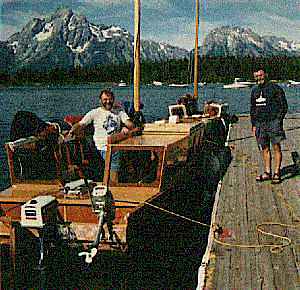 Karl James used 4 hp originally on his Jewelbox but I think he later upped it to 6. His brother Pete built Petesboat to be more of a motorsailer. At the time I was using my Twixt but here we doubled its size to 24' while keeping the same basic sharpie scow shape with a wide transom that just touched the water in normal trim. Pete went cruising at first with just 4.5 hp saying it was fine at displacement speeds in good weather. But the idea was to plane the beast and after a year or two he got a deal on a 60hp job. Went 20 mph at full throttle as I recall with the skipper required to stand in order to see over the bow. He said that the boat, motor, and skipper were a lot happier throttled back to 15 mph. The photo below shows Petesboat in its early days with the 4.5hp motor on centerline and what looks like maybe a 2hp backup.
