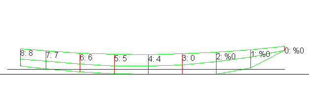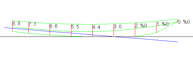 So if you have a good paddle or rowing or sailing boat it is almost guaranteed that it will never support much weight in the stern. (If it could support a lot of weight in the stern the argument would be that it could be a much better low speed boat if the stern were made more streamlined.) And there lies the rub in almost any scheme to put the usual outboard motor on a low speed hull. Here is an example that uses the program Hullforms (get a free sample by clicking on its link way down at the end of this page). The example here is the rowing boat Oracle. You might recall Oracle was used in the "rowboat setup" essay from a few weeks past where Max shuttled himself fore and aft in it to find the best seat location to trim the boat level. In this example let's say the boat weighs 100 pounds and Max weighs 150 pounds. By centering Max's weight 100" from the front the boat trims level and looks like this: