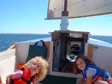 "We had an amazing time living aboard Cormorant (christened "Sea Fever") in Provincetown harbor for 5 days. The tide there was rising and falling about 12 feet a day with the full moon. We'd be high and dry up on the beach for breakfast, swimming off the boat at lunchtime, walking the flats again by dinner. It was a blissful time for me and my wife and two girls. We moved around, took little sails here and there across the harbor (West End to Long Point, then to the lighthouse, then to the East End, etc.) anchoring here and there, usually just running it aground as the tide allowed and staying for a while. Many shells were collected, and tidal pools investigated. Of all the harbors I've ever seen, it is the most alive. It's a couple of miles across and fresh sea water flushes the whole place twice a day. The number of snails, clams, crabs, fish of all sizes, mussels, eelgrass, etc. was just mind-boggling. On high tides I'd go spearfishing (many attempts, no luck) where at low tide I'd been walking around.