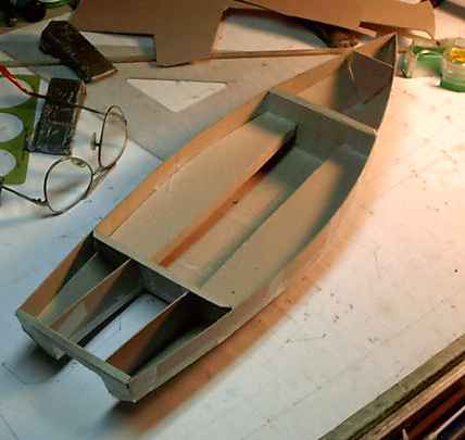 It will still be wobbly but taping the bottom to the cross elements will stiffen it up a lot, as it will with the real boat. I also added the panels that will form the walls of the motor well (by the way when I measured up my motors I found it takes a well 2' wide to allow the motor to turn fully.)