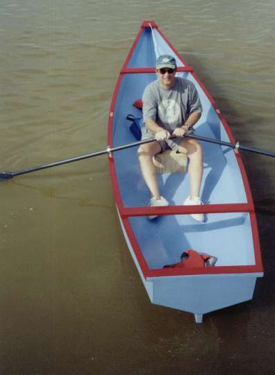 The new shape makes a different sound - a "swish, gurgle" as it cleaves the water, where the original Roar has a "tap, tap" sound typical of boats that go over the water instead of through it. I suspect the original shape is slightly faster in smooth water but the new bow has the edge everywhere else. She'll row at 4-1/2 mph with medium effort using the 7 foot oars detailed in the plans. Adding a passenger to either version will hardly slow her, although acceleration and deceleration are affected.