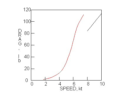 When I look at this I see what all slow speed hulls experience - a "hull speed". As you see, drag rises very quickly at about 5 knots. The usual estimate for "hull speed" in knots is something like 1.3 times the square root of the waterline length (in feet). So if we had an 18' waterline then we would estimate 1.3 x sqrt18 = 5.5 knots. And the above chart sort of agrees with that. I'm not sure if we have gained a lot of new information but it is worth while to look at. Hullform will make curves for a range of weights (the above is for 1200 pounds).