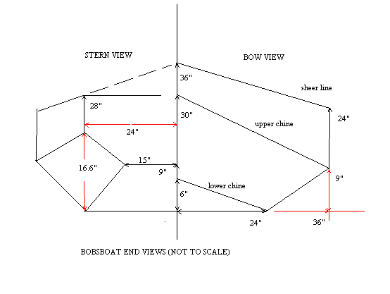 Let's take a quick guess at its displacement using the prismatic coefficient method discussed last time. We will put the draft at 9" which is where the chines and stern will start to immerse. I would expect the boat to go fairly well up until that point, then it will slow dramatically. Here is the endview: