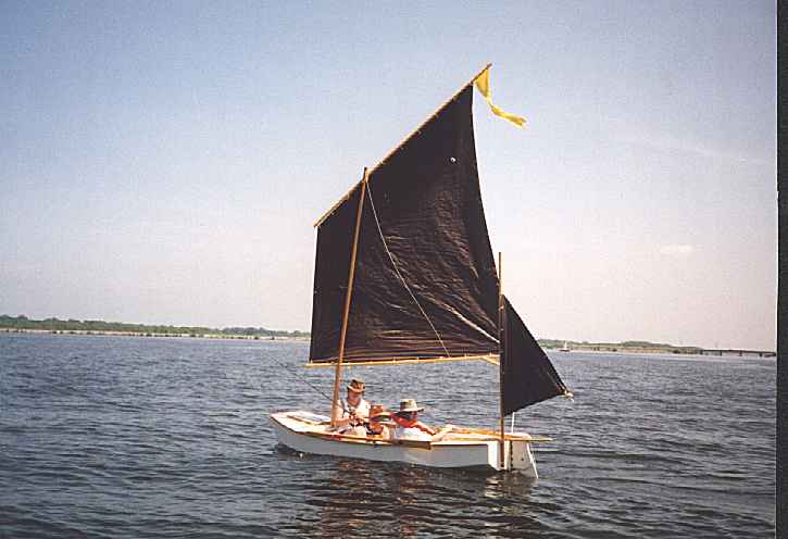 These boats have proven to be good for sail rig tinkerers (be sure to read and apply the Sail Area Math essay before starting). Here I am in Piccup with a polytarp sharpie sprit sail. The rig is different from the originals but the hull here is totally unchanged (except for paint) from the original shown on the beach at Pensacola.