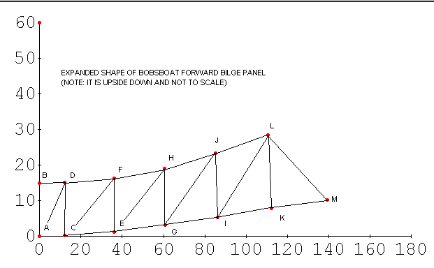 The offsets are input on the left and as you type them in the machine figures the flat panel layout on the right. If I am not using all the input spots in the spread sheet, say I have 13 triangles to plot instead of 16 allowed in the sheet, I type in convenient numbers in the blanks which sometimes results in "error" messages generated by the spreadsheet output but they are of no consequence. Then I ask for an xy chart of the results to see if it looks right, a quick check on my input. For the Bobsboat bilge panel it looks like this: