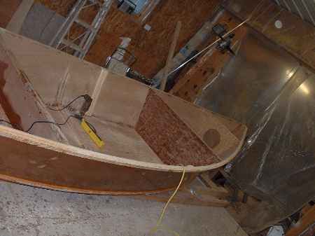 To get Picara to right from 90 degrees with two adults sitting on the aft deck requires 500 pounds of steel ballast spread flat on the deepest part of the boat's bottom in addition to using a 1" thick plywood bottom which also has about 100 pounds of ballast effect. Sound like a lot? Maybe so but the numbers kept coming up the same using Hullforms6 to figure the hydro work. I believe it. I tried it with water ballast but gave up. Steel is over eight times as dense as water so the 1-1/2" steel plate I show as ballast would be equal to a water tank over 12" deep to match the weight, but with internal ballast the water would end up centered about 6" above the bottom where the steel sits centered .75" above the bottom so the water ballast was no where near as effective here as steel. It won't work here.