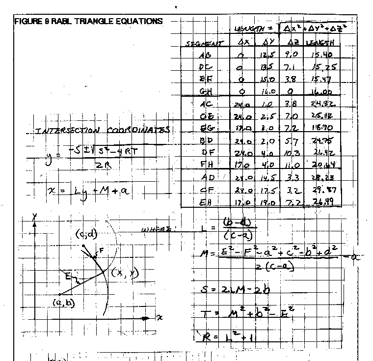 In this old example we have two points, one with coordinates a,b and the other with coordinates c,d. From point c,d we swing an arc of length F and from a,b we swing an arc of length E. Those two arcs intersect at point x,y and that is what we are looking for. The two equations in the upper left for x and y require you to solve first a bunch of factors shown in the lower right. Computers are really good at figuring this sort of stuff, even my Apple 2c would spit out the answer in a nano second.