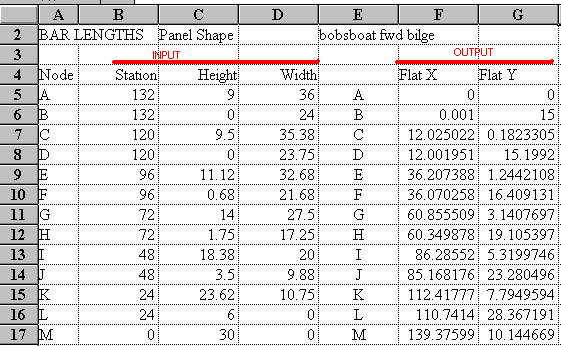 As I got more sophisticated in my used computers I eventually came up with a spreadsheet in MSworks that would do that for me up to sixteen triangles at a time. The machine works to a huge degree of accuracy and the problems of working with the drawing board all go away. Then it just becomes an issue of inputting the offsets correctly. Here is a portion of the results of the Bobsboat forward bilge panel.