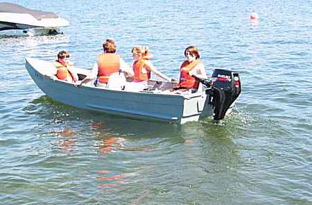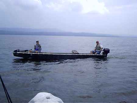 Max's AF4 has been shown in this website many times and is a veteran. Hasn't changed much at all although it has gone through a weight saving program, as has Max. Still has the old 18hp Johnson with an even older 5hp Johnson for backup. Max slept in it on Friday in this cove, going for a midnight plus swim. On Saturday he put it on the trailer for an early Sunday getaway and slept in it on the trailer at a campsight. You can see the size of the main lake outside the cove and glass smooth conditons we had most of the weekend.