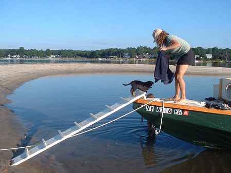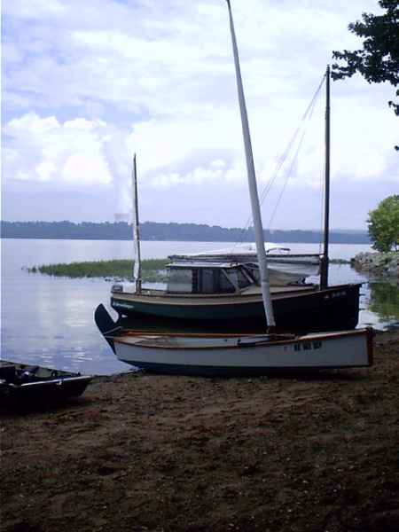 Another messabout veteran, Richard Spelling, brought his much traveled Bolger Light Cruiser which is a Chebacco variant. 20' long, I think, very roomy and open inside the cabin with no hint of the "cave" feeling you get in other cabin boats. Gaff rigged which folds down in a jiffy and a centerboard. I still have to go "sailing" with Richard in this boat. We went out with the sails set but seldom had enough wind to see what it would do. It did pop right along at over 6 mph with his 4hp outboard. Metal steps on the bow also good for ramming.