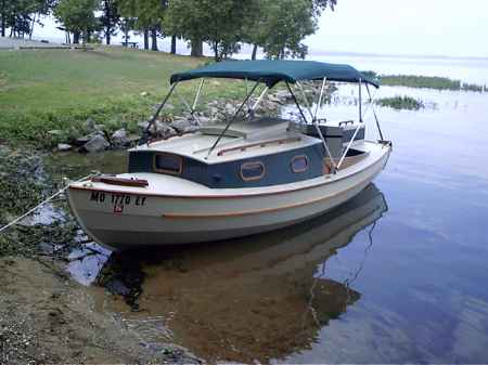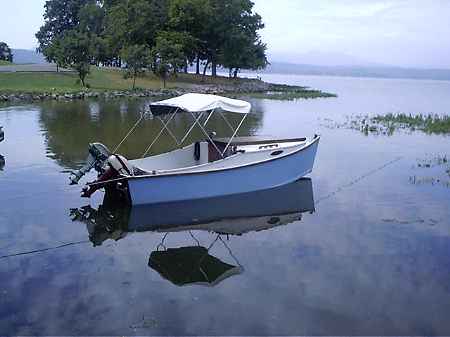 I've tried several different ways to shape a hull to handle rough water. Rough water is a problem around here where the manmade lakes are flat and wide and shallow. We get whitecaps when the wind blows about 12 mph. I think the situation is about the same in a lot of places, like the Gulf Coast and the Chesapeake. When you do a power boat that is supposed to plane the situation becomes critical from the standpoint of control and of pounding to destruction of the hull or of the skipper. In boats like Brucesboat and Dorado I tried it with multichines to give a bit of a flat bottom. That makes the boat easier to use, I think, because it will beach sitting straight up and you will have a bit of a flat to walk on. I've also shaped the bow as in Twang to make the boat meet a wave a little bit at a time instead of with a sudden bang as with a flat bow. But the problem with a planing boat is that at speed it won't meet the water with its bow. Instead it will rise out of the water to meet it with its mid bottom. So with Veep14 I tried a V bottomed skiff.