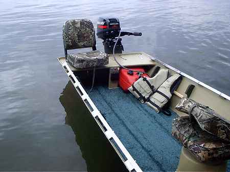 What we have here is a genuine White River jonboat, this built maybe 30 years ago in very limited production in fiberglass. Here is a view of the interior stern: