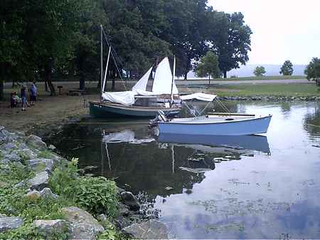 The main lake of the river opens up to the right of the photo, maybe a mile wide here and of course very very long. There was no significant powerboat traffic during our two days. The cove shown here is about 2' deep with a nice sandy bottom. Campground within an easy walk and a pavilion which Phil rented about at the photographer's position, ie, very close. About the most perfect setup of any messabout I've attended.