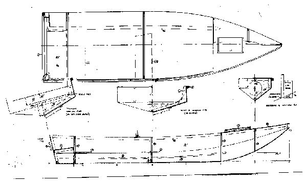 Construction is taped seam needing four sheets of 3/8" plywood for the basic hull and one sheet of 1/4" plywood for the bulkheads and decks.