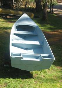 Veep14 might be a handy all around small skiff which I would hope would take some rough water. (I see a bit of falseness in the idea that it would be "safer" than a flattie because the skipper might be tempted to venture forth in worse and worse weather while the flattie skipper will clearly chicken out and stay in protected areas. So when the V bottomed skipper finally gets in over his head it might be during weather in which no one will attempt rescue.) Veep14 has a constant V all the way along the bottom twisting to a high deep V bow in the forward third. The V reduces the capacity of the boat compared to a flat bottomed job. In this case it would be about 600 pounds maximum which would include the weight of the hull, motor, and gear. That might amount to 300 pounds so you see it is a two man boat at the most.