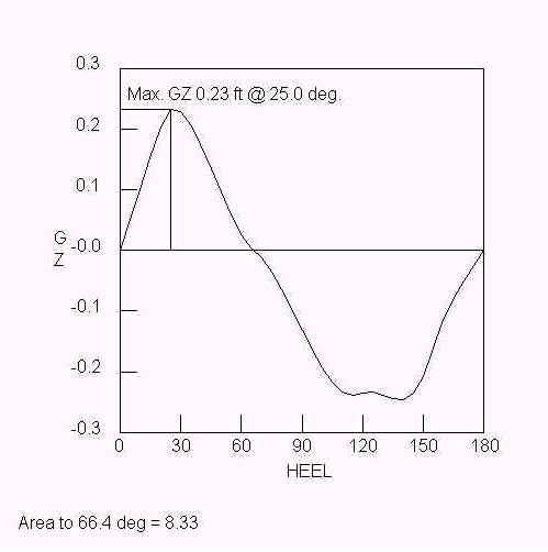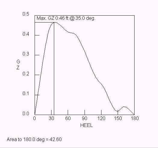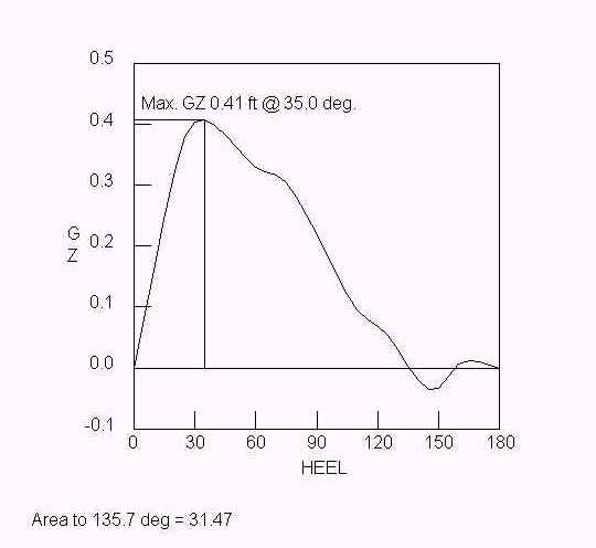 The chart tells us a lot more information. The number gz is the "righting arm". You can think of the righting moment as a torque determined by the weight times the righting arm. So in this case it would be 1500 pounds times .35' = 525 ft-lbs. It is also telling us the maximum righting moment is at 30 degrees of heel. That would also be the point where you could carry the maximum sail. The area under the curve to capsize is also given. I've forgotten exactly what that means but I think it might be looked upon as the "power" of the boat to self right.