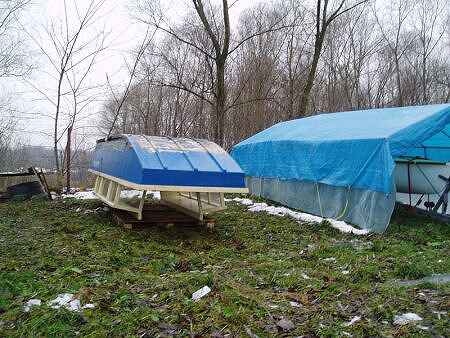 It is 15' long, 4' wide and 3.5' deep. More or less the same size as my AF3 but has no open cockpit. It is totally decked over and you are supposed to sail it from the inside. Robb specified very rugged construction, 1/2" plywood all around, and a total weight of at least 1500 pounds which is at least twice what a typical lake trailer sailer of that size would weigh.