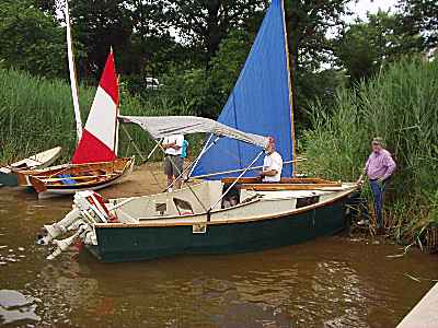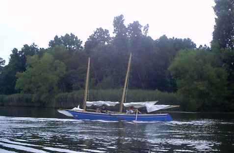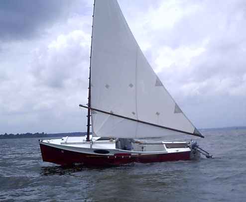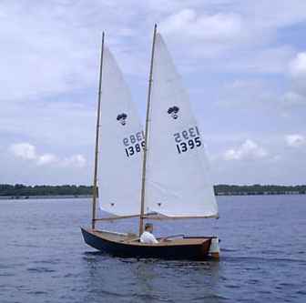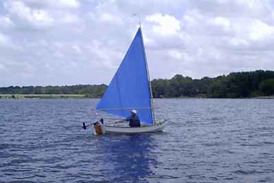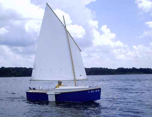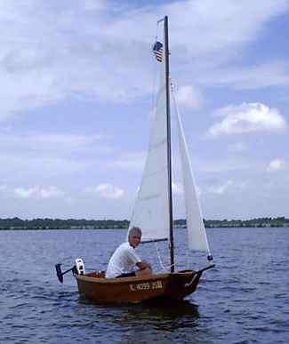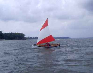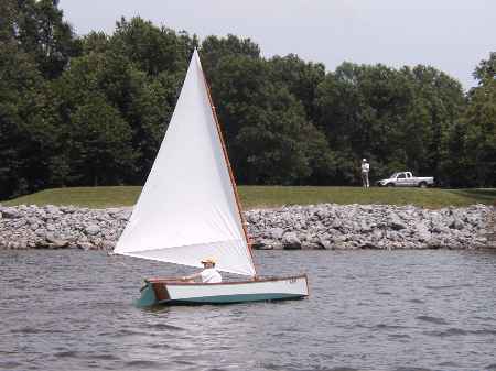 In front of Bob's canoe in that photo is Paul Ellirit's perfect quality Acorn Skiff from Columbia, Mo.. Here is a photo of him sailing along: