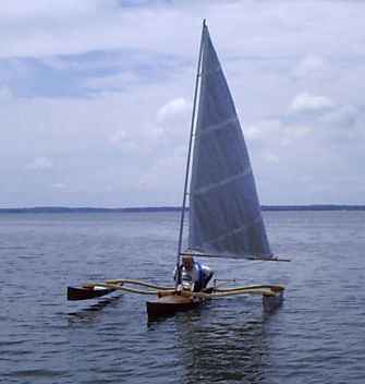 A Vector builder is keeping a website of the project at http://www.geocities.com/michsand@sbcglobal.net/ but in the meantime I got photos of a Vector completed by Pete Mohylsky in Florida. Here he is fussing with his sail. Hopefully a report soon:
