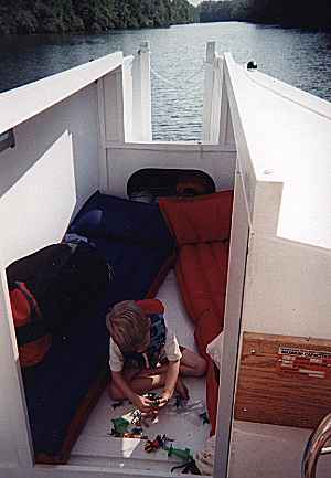 My son Noah, ages 5 and 6 in the photos, loves the boat. Plenty of room for lounging at his age. My nephew Kevin, also pictured at age 16, has been coming along. They slept in the cabin on air mattresses: I slept in the cockpit on a beach chair laid flat which fits from corner to corner. On my last trip my wife, son and 3 year old daughter came and we all comfortably coexisted although we heard lots of comments like "They've got two little kids in that boat, can you believe it?" We didn't get a single photo on that last trip, although enjoyable, much of it was gloomy weather and we were occupied with the kids.