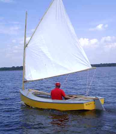 I never heard much of that boat but the second by Mike Sandell showed up at the 2006 Rend Lake Messabout much to my surprise (I had to ask what it was) and I got to talk to Mike and see it sailing for two days. Mike has a website at http://www.geocities.com/michsand@sbcglobal.net/ (archived copy) where the building is well covered. He was still quite new to the boat but especially on the second day, after he had tweaked the lines on his polytarp sail, he had no trouble sailing and sometimes leading the fleet.