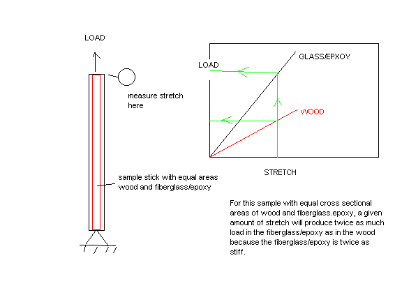 As the sample is pulled the wood and glass and epoxy all must stretch (strain) the same amount. But since the glass/epoxy is twice as stiff as the wood, it will take twice as much force to get to the same amount of stretch. So if the sample is loaded to 300 pounds, the wood takes 100 pounds of the total and the glass/epoxy takes 200 pounds. (You might note that this system will only work well if the stiffer material is also stronger in the same ratio. If not it can fail before the wood fails, quickly dumping all its load into the wood which might cause a failure there. By the same token in this example, the wood core should fail before the glass/epoxy and when it does it will dump its load into the glass.)