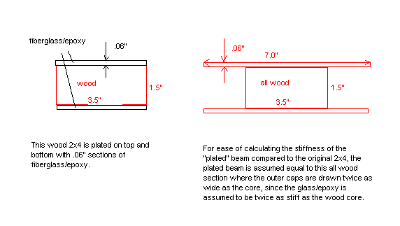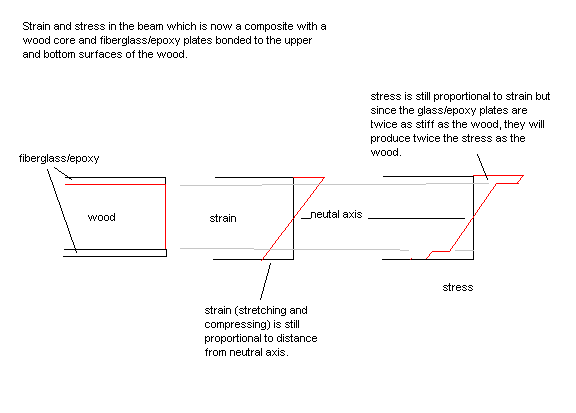 Let's say he "plates" the top and bottom of his 2x4 with a layer of glass/epoxy .06" thick. Has he stiffened the beam? Let's now look at the strains and stresses in the plated 2x4: