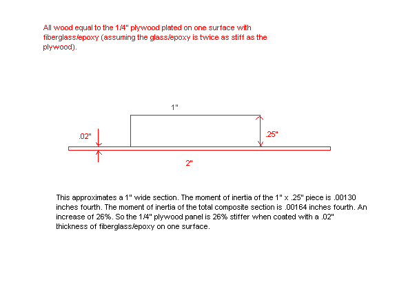 A QUICK LOOK AT FIBERGLASS...I googled around a bit to find the strength/stiffness properties of epoxy and fiberglass. All sources showed big ranges so they must vary quite a bit from maker to maker and in different layups. Like wood, a fiberglass/epoxy layup has different properties in different directions depending much on the directions and densities of the fibers, etc. But in a general way I think epoxy alone has properties about like wood both in stiffness and strength. So adding a layer of epoxy to wood would not improve its strength or stiffness except perhaps to seal and heal cracks in the underlying wood.