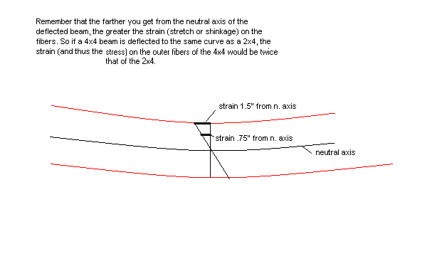 Since the outer fibers of the 4x4 are twice as far from the neutral axis as compared to the 2x4, they will strain twice as much for a given curvature (deflection) of the beam. Like this: