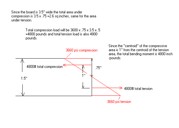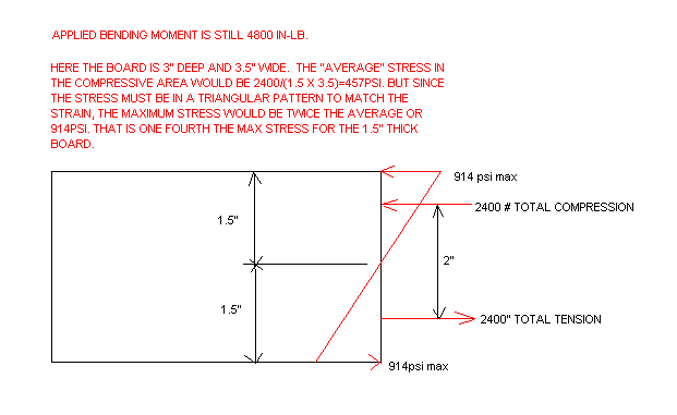 (Now, I'm going to review a bit how the calculations are done. The maximum applied bending moment is right under the man's weight and it is in numbers the 100# reaction force on the sawhorse support times the 48" distance to the center, or 4800 inch-pounds. So the forces internal to the board at that point must equal 4800 inch=pounds. OK, the top and bottom area of our strain diagram form triangles that are 3.5" wide and .75" deep (half the depth of the (2x4). Let's look at the top triangle which is in compression. The total sum of the compressive force there can be thought to act through a point .5" from the center of the board since the "average" of that triangle will act 2/3's of the way from the tip of the triangle. Same with the lower triangle which represents tension. So the two triangles can be thought to work a total of 1" apart. If so then the total load of each triangle must be 4800 pounds in order to get an internal bending reaction of 4800 inch-pounds. Now to calculate the maximum stress: Total area in compression is .75" x 3.5" or 2.625" so the average compressive stress would be 4800/2.625=1830 psi. But since the distribution is in the form of a triangle the maximum at the outer fibers will be twice that average, or 3660 psi.)